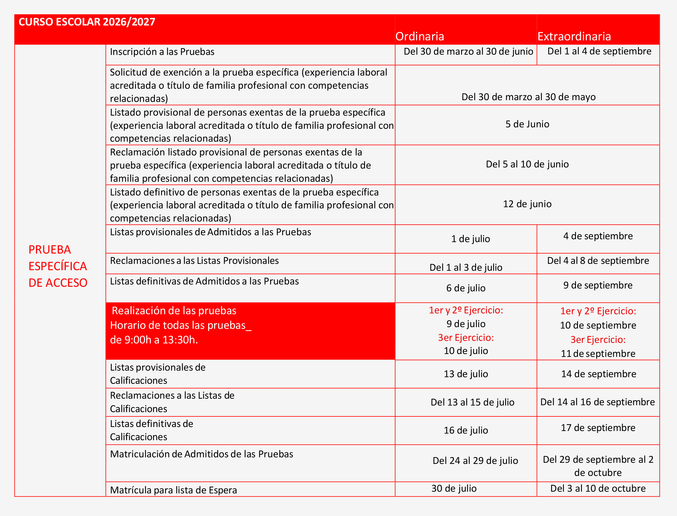 Calendarios pruebas de acceso